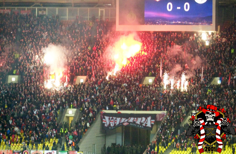 Bij opkomst van de spelers verscheen een mooie choreografie aan de overzijde, welke werd opgevolgd door veel vuurwerk. Tijdens de minuut-stilte bleef de zang aanhouden. Over de wedstrijd kunnen we kort zijn, deze is er in Moskou namelijk niet geweest. Na de 2-0 in de 30e minuut was het al over en uit. Toch blijf je dat beetje hoop houden op een mirakel, zoals altijd. Maar tevergeefs. Pas in de tweede helft kwamen er serieuzere kansen. Dat er zelfs in 180 minuten voetbal niet werd gescoord tegen Spartak Moskou is zeer teleurstellend te noemen.