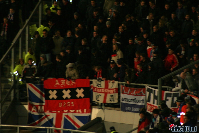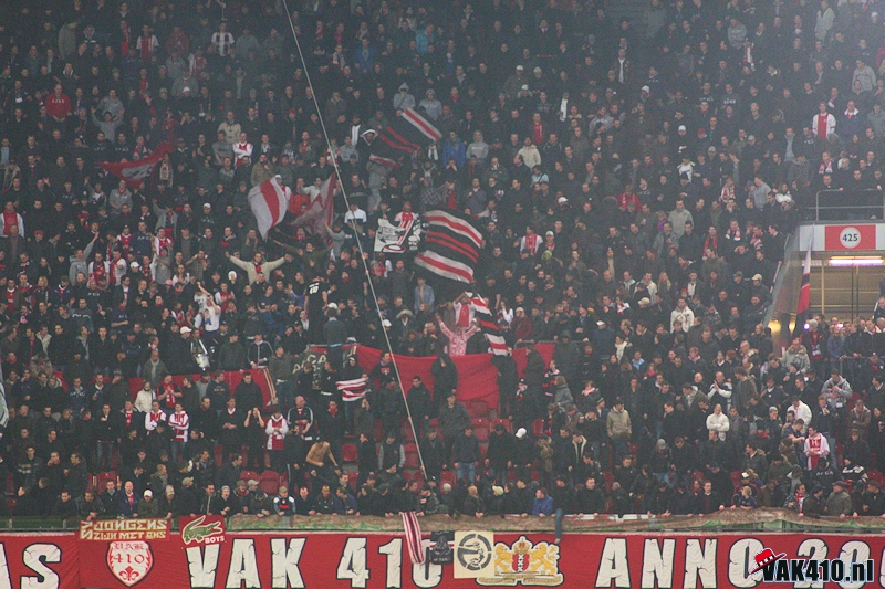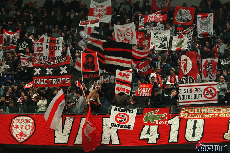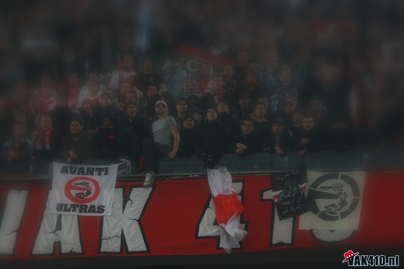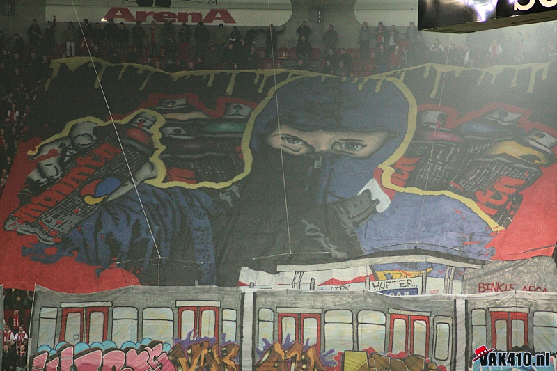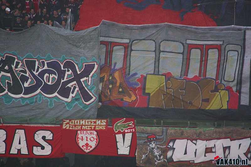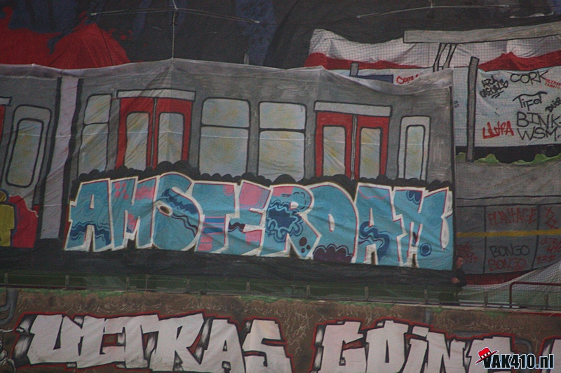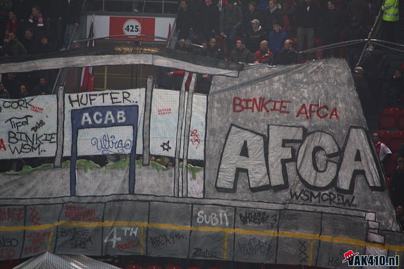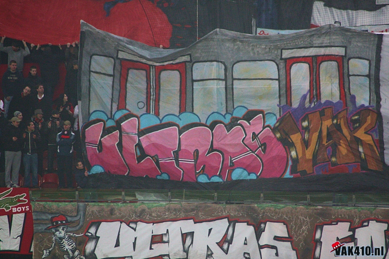 Bij opkomst van de spelers verscheen er op VAK410 weer een fantastisch schouwspel. Dat VAK410 meer is dan 90 minuten support op de tribune is al meer dan 9 jaar duidelijk. Het is een manier van leven. Waarin graffiti een podium biedt om op een andere manier jezelf creatief te uiten. Op je weg naar het stadion kun je de AFCA silvers niet ontgaan zijn. En ook de VAK410 silvers en pieces groeien als paddo’s uit de grond. ULTRAS GOING UNDERGROUND! De foto’s vertellen de rest.