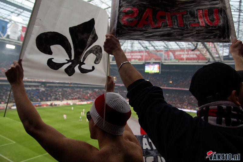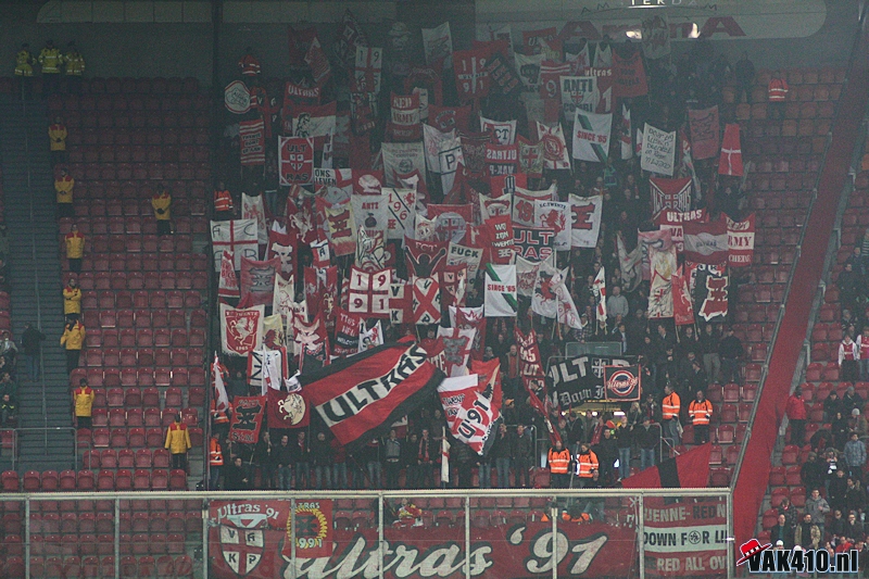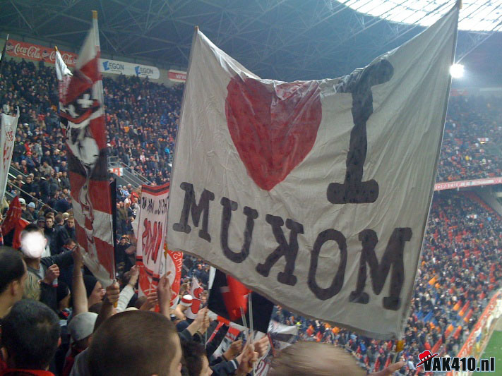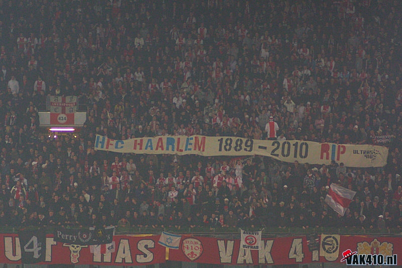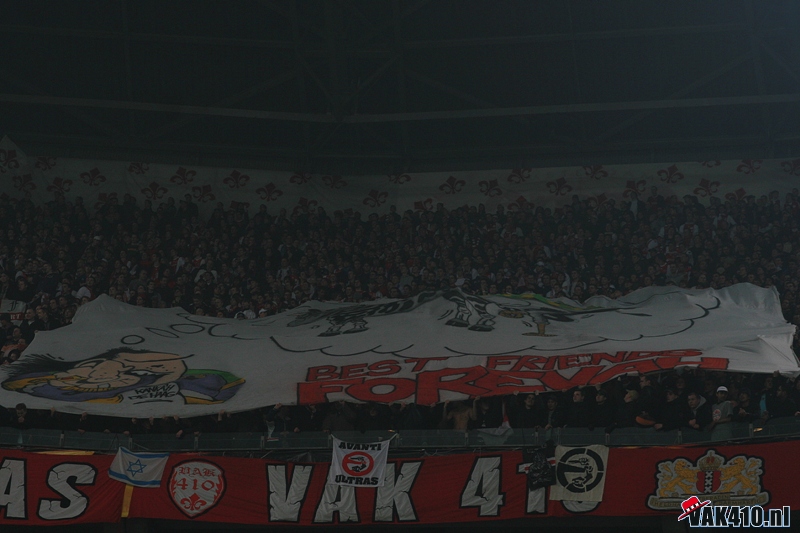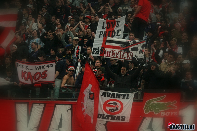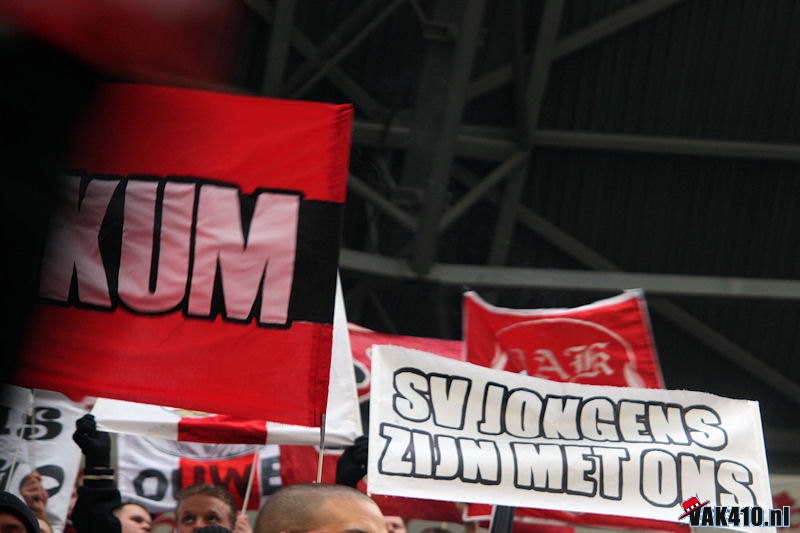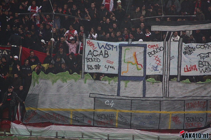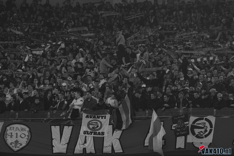Bij opkomst van de spelers verscheen er op VAK410 weer een fantastisch schouwspel. Dat VAK410 meer is dan 90 minuten support op de tribune is al meer dan 9 jaar duidelijk. Het is een manier van leven. Waarin graffiti een podium biedt om op een andere manier jezelf creatief te uiten. Op je weg naar het stadion kun je de AFCA silvers niet ontgaan zijn. En ook de VAK410 silvers en pieces groeien als paddo’s uit de grond. ULTRAS GOING UNDERGROUND! De foto’s vertellen de rest.