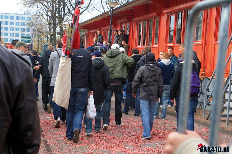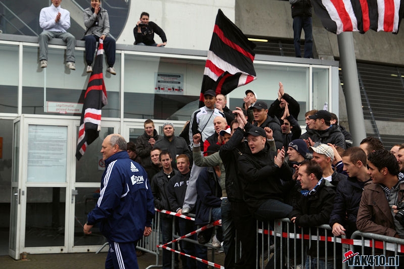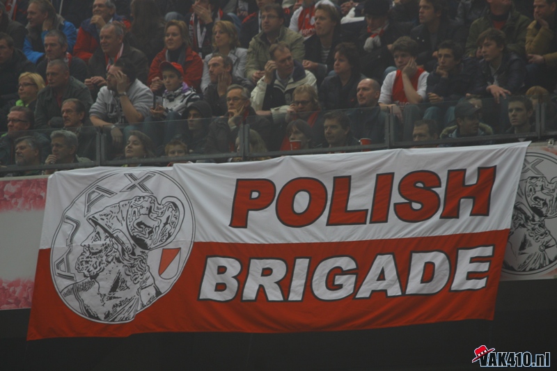 De medewerking van de overige Ajacieden om de spandoeken goed uit te rollen laat nogal wat te wensen over. Ook de taak van het omhoog houden van een spandoek, zien sommige na 20 seconden alweer als voldaan… Het uitvak: de ene helft met supporters, de andere helft met toeschouwers. De support was bagger te noemen. In een wedstrijd zo belangrijk als deze, horen onze jongens op het veld gewoon de volle steun te krijgen!