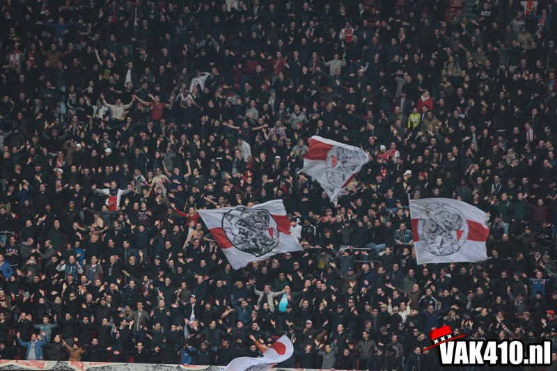 Uiterraad slaat dit over op de tribunes. Na elke kans of aanval wordt het volume van de support harder, ziet ook onze gast Hedwiges Maduro. Nadat twente terugkomt tot 2-2 is daar de 3-2 na zo'n 70 minuten. Vanaf het vak klinkt vervolgens massaal 'Dale'. Als 5 minuten later de 4-2 erin ligt is het vak niet meer te houden. Met onder meer '90 minuten lang' trilt het beton. Ook de vakken naast 410 springen mee. Ajax sleept onder leiding van spelers uit eigen jeugd de overwinning binnen en we kunnen dan ook terugkijken op een mooie avond.