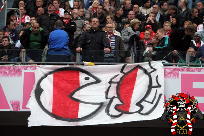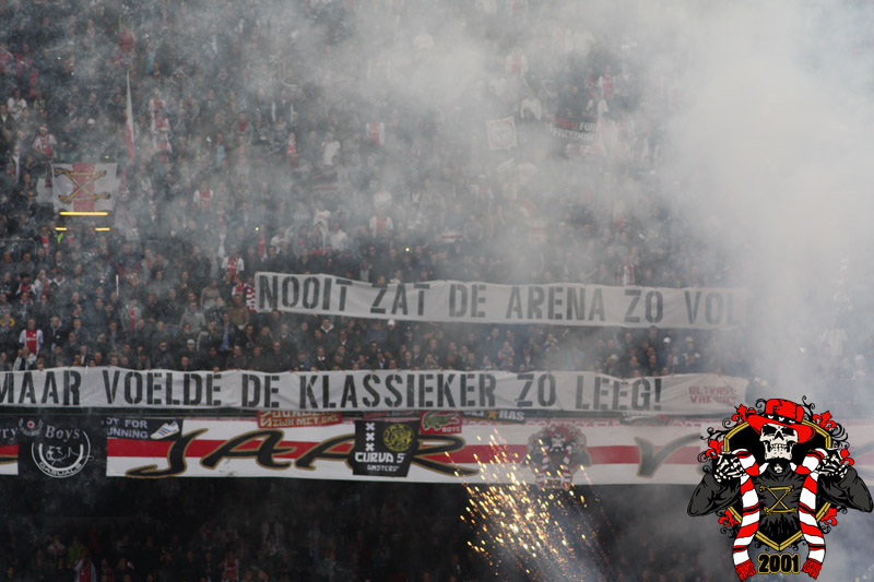 Jaarlijks vinden er rondom de Klassieker vaste rituelen plaats: bezoek aan de laatste training en de nacht ‘voor’. Dit jaar is op aangeven van Frank de Boer de laatste training besloten afgewerkt, dus dat ritueel ging niet door. Vroeg in de avond werd er door een groep bij het honk verzameld, van alle kanten wordt er drank en eten aangereikt. Aangezien de tempraturen ’s nachts weer tegen het vriespunt liggen wordt er een vuurtje opgestookt. De smeris komt ook nog even kijken, 8 busjes sterk. Als gauw zagen ze dat het om een groep Ajax ging, in tegenstelling tot hun eerdere gedachte naar een groep van de andere club.