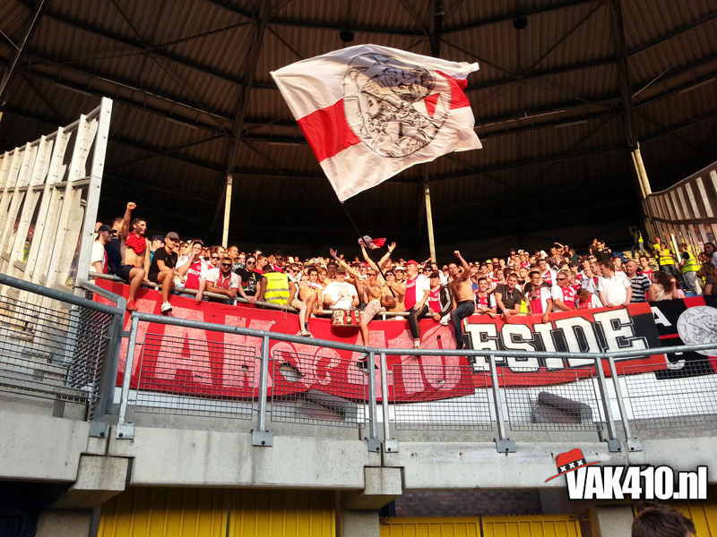 Onze bus komt als eerste aan bij het stadion van de blauw-witten. Bij aankomst blijkt maar weer eens hoe onnodig moeilijk het supporters iedere keer weer gemaakt word. In het voor overleg is er aan Ajax aangegeven dat het is toegestaan om 50bandieri’s mee te nemen, één drum, en geen GROTE spandoeken. Een groot spandoek, tja wat moet je daar anders van maken dan zo één die we zo nu en dan over de tribune laten gaan…? Echter, bij Heerenveen noemen ze het VAK410 uitdoek een groot spandoek, deze mag niet mee naar binnen. Een gesprek over de velen portofoons en oortjes volgt, duurt lang en duurt maar. Dan komt ook de F-side binnen, zij mogen zich bij ons voegen en ook de gesprekken afwachten. Wanneer ons doek niet naar binnen mag, gaan wij ook niet naar binnen, onze identiteit pak je niet van ons af! Eindelijk positief bericht volgens een medewerker van Heerenveen, die ene mag mee naar binnen, maar die ander niet! Een keuze die beide groepen uiteraard niet kunnen accepteren! Na lang onderhandelen en veel onnodig geouwehoer, kunnen we eindelijk allemaal een plekje zoeken in het uitvak en de groepsdoeken ophangen.